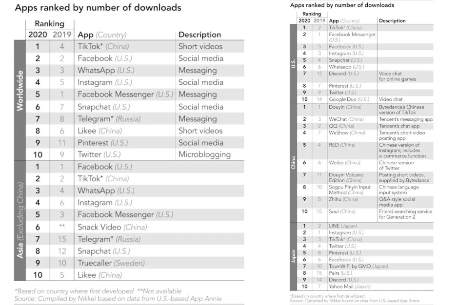 E’ la testata Nikkei Asia a mettere nero su bianco i dati rilevati da App Annie, che mostra il dominio di TikTok che in un anno è passata dal quarto al primo posto, lasciandosi dietro tutti i colossi della Facebook Company, come Facebook, WhatsApp, Instagram e Facebook Messenger.