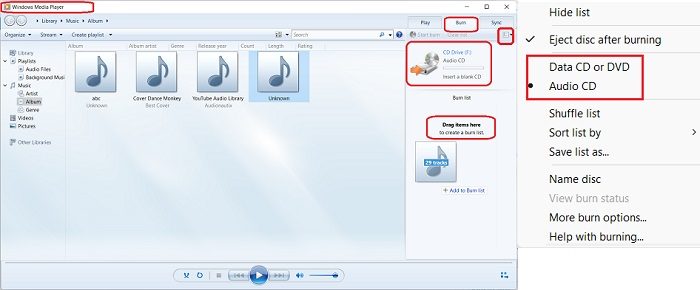 - Fai clic sulla piccola freccia accanto e selezionare le opzioni dal menu tra CD audio, CD dati o DVD.