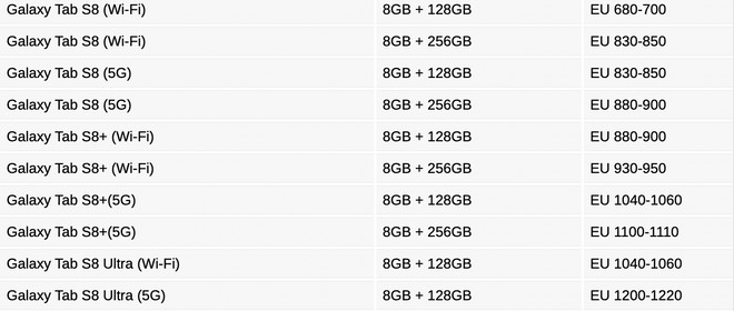 Ecco la tabella ufficiosa Samsung sui prezzi del prossimo Galaxy Tab S8