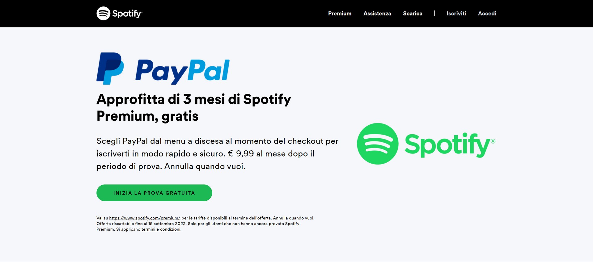Questa promozione è valida fino al 15 settembre 2023 per gli utenti PayPal con un conto in regola attivo in Italia. La promozione non può essere condivisa con altri ed è valida solo una volta per ogni utente. La promozione si applica solo al piano Individual di Spotify Premium e fornisce 3 mesi gratis di Spotify Premium.