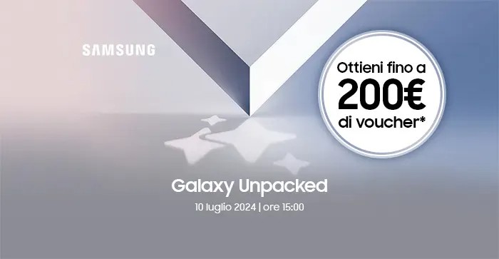 Voucher riscattabile al termine della compilazione del form, entro il termine ultimo 10/07/2024 ore 10.00, e spendibile in negozio o online sull’ acquisto dei nuovi Galaxy valore voucher 200€ se acquisti uno dei nuovi smartphone dal 10 al 15/07/2024, valore voucher 100€ se acquisti uno dei nuovi smartphone dal 16 al 23/07/2024, valore voucher 50€ se acquisti uno dei nuovi indossabili dal 10 al 23/07/2024.