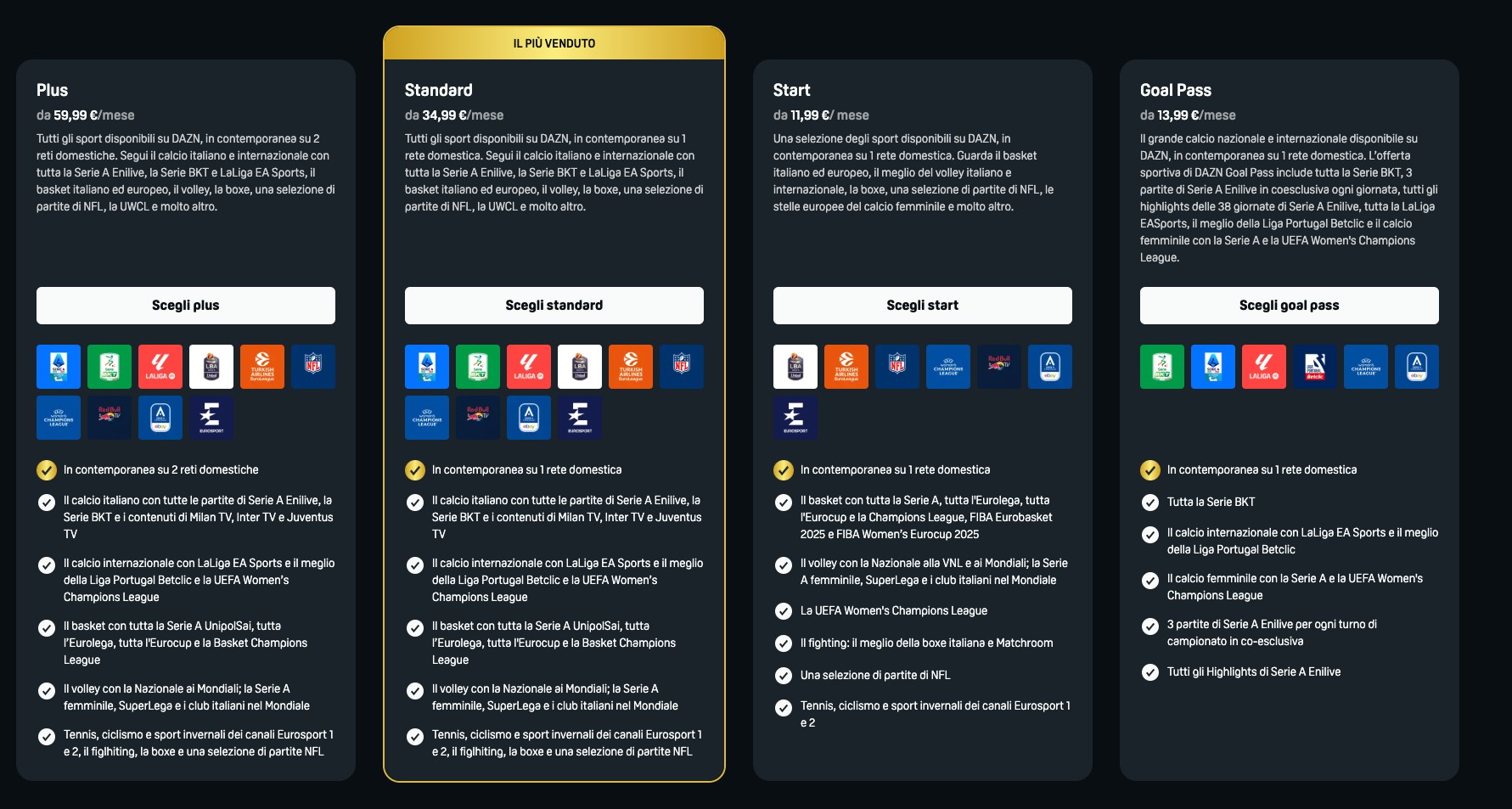 69 euro all’anno, che fanno 5.75 euro al mese, per il piano DAZN Start che include tutto lo sport, anche la visione dei canali Eurosport 1 ed Eurosport 2 e non incluse la Serie A e la Serie B. Due dispositivi in contemporanea nella stessa rete.