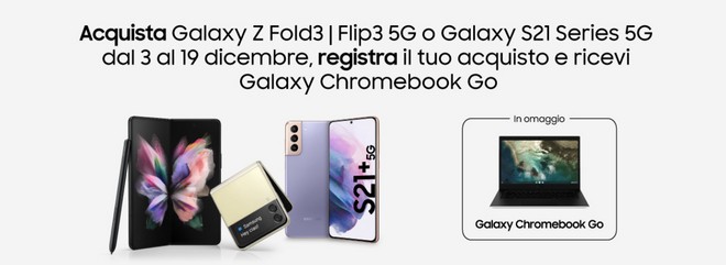 Infatti chi acquisterà un Galaxy Z Fold 3, uno Z Flip 3 o uno dei modelli della gamma S21 tra il 3 ed il 19 dicembre riceverà in regalo il Chromebook Go (XE340XDA-KA1IT). Un ottimo notebook con Chrome OS del valore di ben 399 euro spedito a casa completamente in regalo.