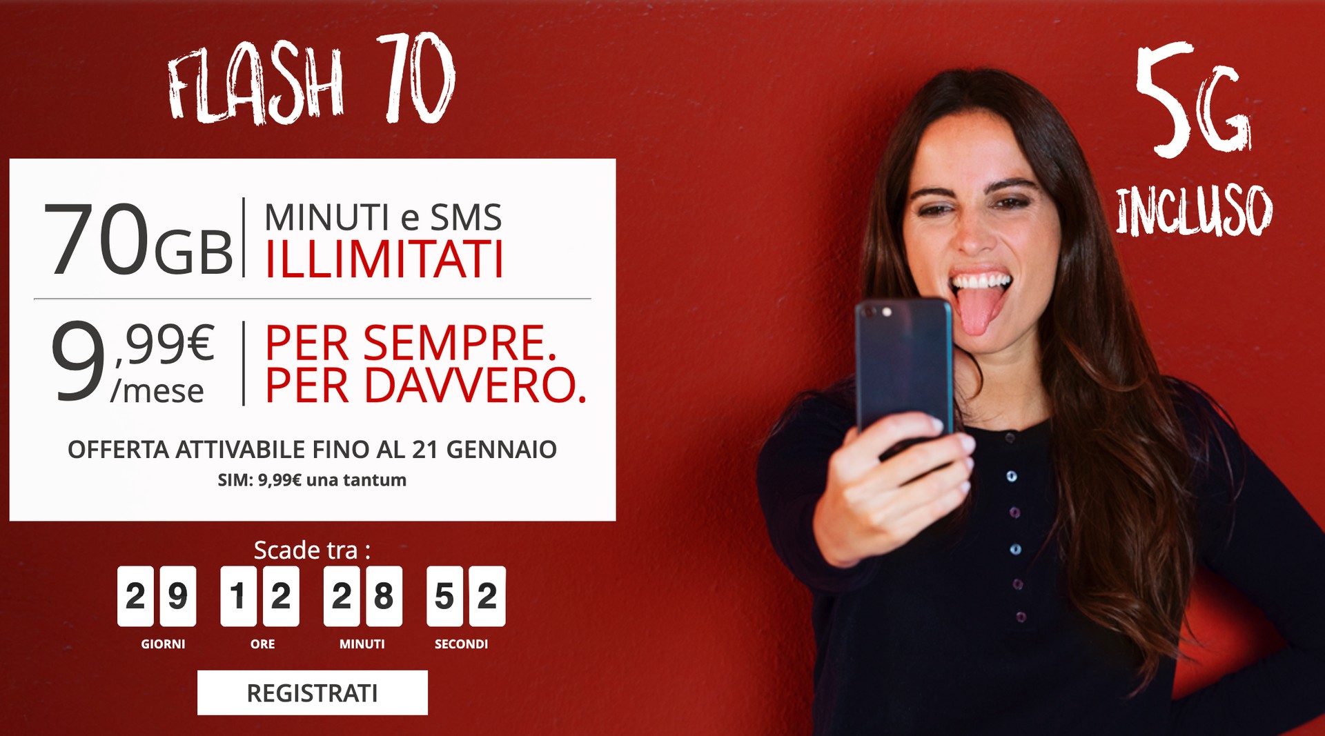 Si chiama Flash 70 ed è il primo piano con 5G incluso di iliad che verrà lanciato nell’estate 2021 dall’operatore francese anche in Italia. Costerà 9,99 euro al mese e metterà sul piano tanti Giga da usare tutti in 5G oltre che minuti ed SMS sempre illimitati come su tutti i piani tariffari di iliad e in questi che mancano al lancio, l’operatore lavorerà sulla copertura che è ancora molto scarsa.